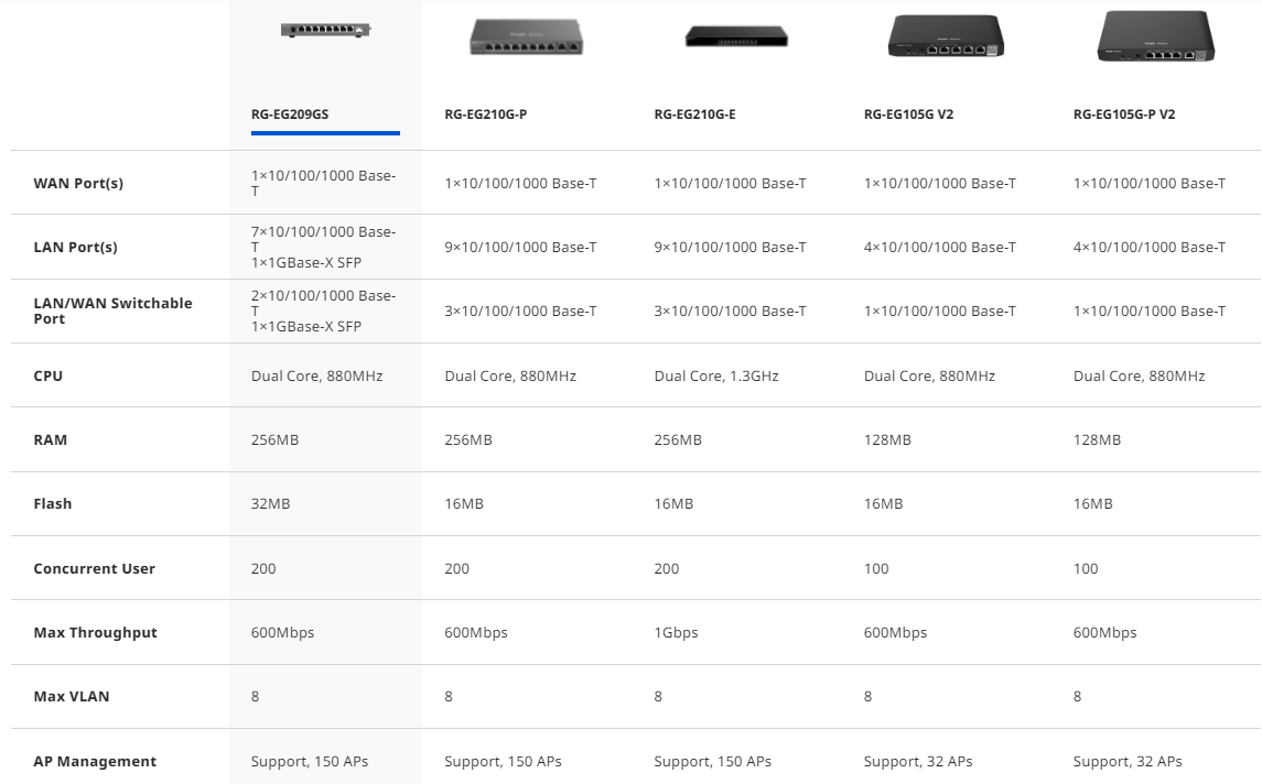 Ruijie RG-EG209GS nube Sin POE 8 GE 1 puerto SFP GE,1 WAN, 5 LAN y 3 LAN-WAN, 200 usuarios, 600 Mbps