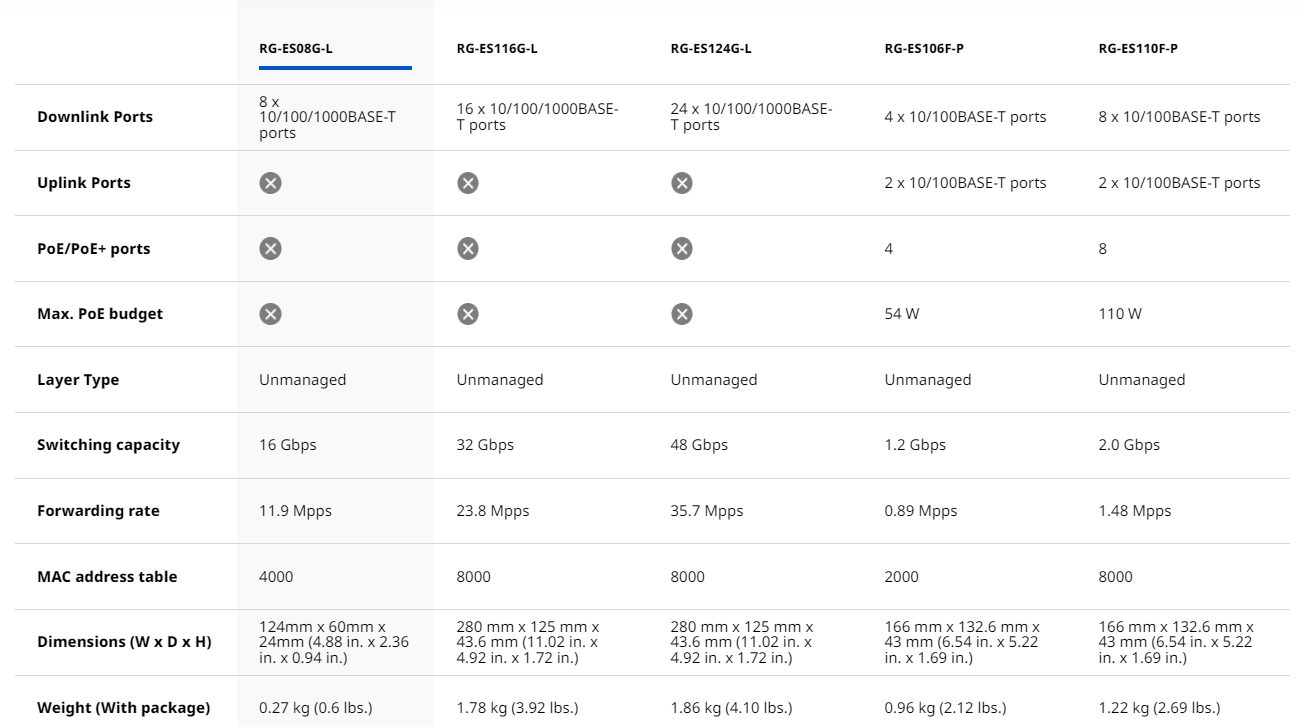 Ruijie RG-ES08G-L 8-Port Gigabit no administrado Switch, 8 Gigabit RJ45 Ports , plástico