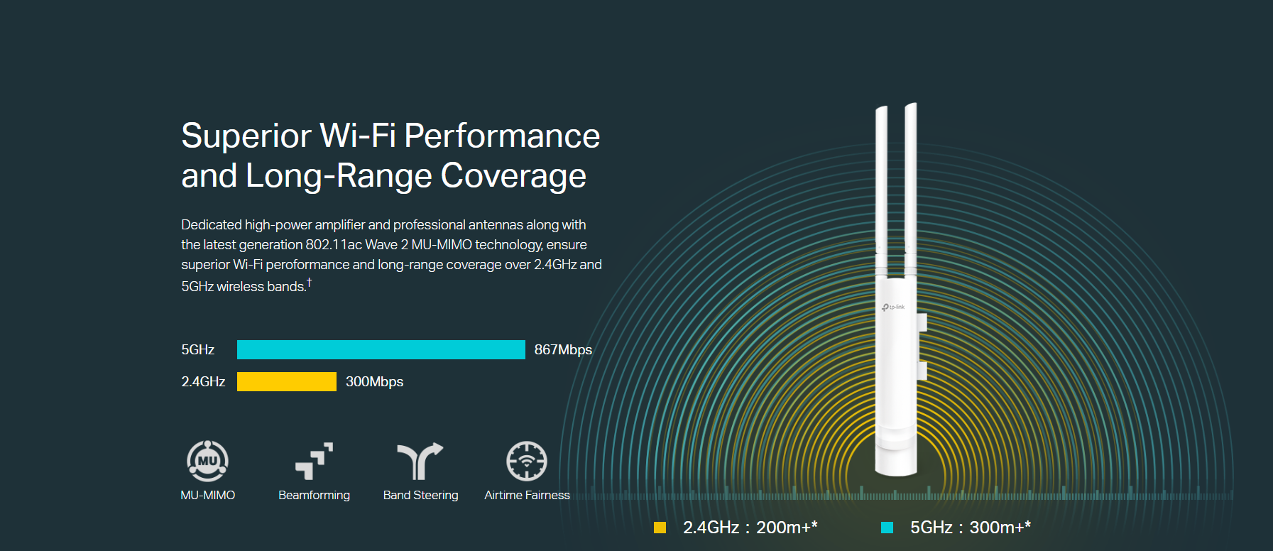 Cobertura de largo alcance: Amplificador de alta potencia dedicado y antenas profesionales, junto con la tecnología MU-MIMO 802.11ac Wave 2 de última generación.